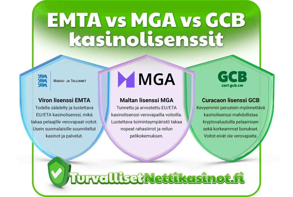 MGA on suomalaispelaajalle selkeästi parempi vaihtoehto. MGA on EU/ETA-lisenssi, joten voitot ovat verovapaita. Valvonta on tiukempaa: vuonna 2024 MGA perui 8 lisenssiä ja jakoi sakkoja 306 250 euron edestä. Curacao ei kuulu EU:hun, voitot ovat verotettavia, ja valvonta on huomattavasti heikompaa.