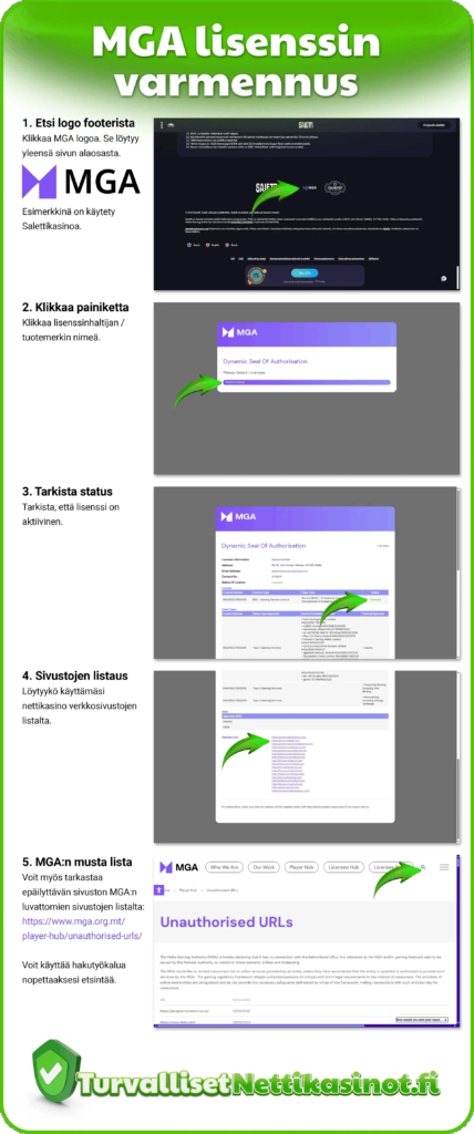 Vaihe 1: Etsi lisenssinumero. Mene kasinon sivulle ja scrollaa alas footeriin, yleensä copyright-tekstin viereen. Lisenssinumero on muotoa MGA/B2C/XXX/YYYY. Jos numeroa ei löydy, se on ensimmäinen varoitusmerkki.